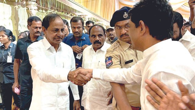 ఆదివారం జరిగిన ఈ కార్యక్రమంలో ఉమ్మడి ఘటకేసర్ మండల మాజీ జడ్పిటిసి సభ్యులు, బోడుప్పల్ మున్సిపల్ కార్పొరేషన్ బీఆర్ఎస్ పార్టీ అధ్యక్షుడు మంద సంజీవరెడ్డి రెడ్డి ఈ వివాహ కారిక్రమం చూసుకొని వెళుతున్న సమయంలో నమస్కారం సార్ ఎలా ఉన్నారు అని పలకరించగా ముఖ్యమంత్రి కేసీఆర్ స్పందిస్తూ నేను బాగున్నా… బాగున్నవా సంజీవ అని పలకరిస్తూ కరాచలనం చేసుకున్నారు.