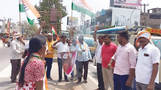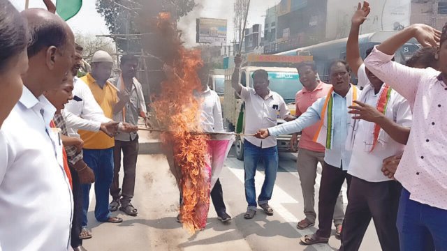 హుజురాబాద్, ఏప్రిల్ 4 (విశ్వం న్యూస్) : ఈరోజు నిన్న పదవ తరగతి ప్రశ్న పత్రం లీకేజ్ అయినందుకు నిరసనగా ఎన్ ఎస్ యు ఐ రాష్ట్ర అధ్యక్షులు హుజురాబాద్ నియోజకవర్గం ఇంచార్జ్ బల్మూరు వెంకట్ హైదరాబాదులో కార్యక్రమం చేస్తే అక్రమంగా అరెస్టు చేసి 14 రోజు రిమాండ్ విధించడం జరిగింది. నిరసనగా హుజురాబాద్ టౌన్ కాంగ్రెస్ పార్టీ నాయకులు రాస్తారోకో కార్యక్రమంలో కెసిఆర్ దిష్టిబొమ్మ దహనం చేశారు. ప్రభుత్వాన్ని ప్రశ్నిస్తే కేసులు పెడతారా ప్రతిపక్షాల గొంతు నొక్కడమే ప్రభుత్వం పనిగా అయిపోయింది. బల్మూర్ వెంకట్ విడుదల వరకు కాంగ్రెస్ పార్టీ ఆధ్వర్యంలో పెద్ద ఎత్తున నిరసన కార్యక్రమాలు చేపడతామని ఈ ప్రభుత్వాన్ని హెచ్చరించారు.