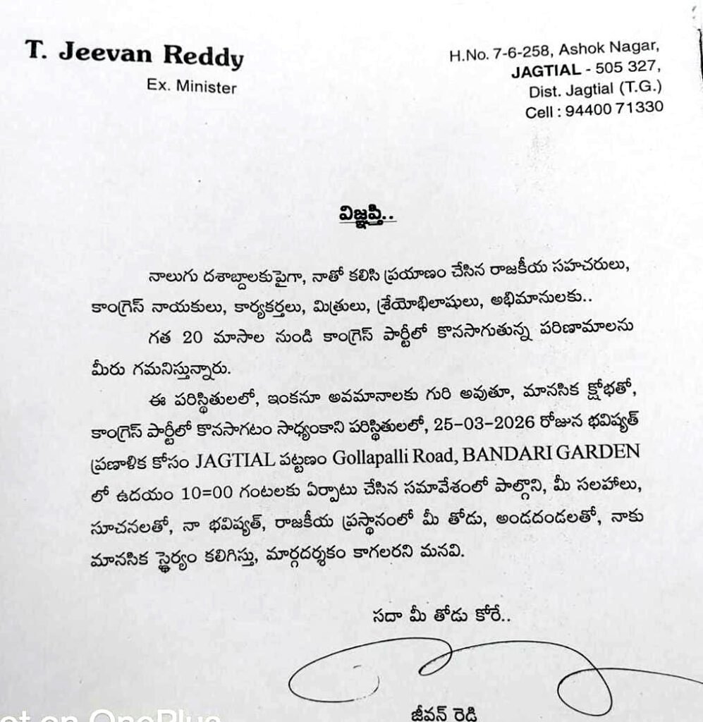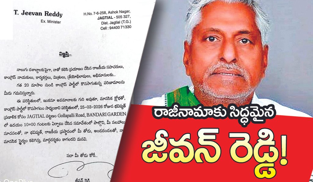 జగిత్యాల, మార్చి 22 (విశ్వం న్యూస్): కాంగ్రెస్ పార్టీలో ఇటీవల చోటుచేసుకుంటున్న పరిణామాల నేపథ్యంలో మాజీ మంత్రి టి. జీవన్ రెడ్డి రాజీనామాకు సిద్ధమైనట్లు సంకేతాలు ఇచ్చారు. నాలుగు దశాబ్దాలుగా కాంగ్రెస్ పార్టీకోసం కష్టపడి పని చేసిన నాయకులు, కార్యకర్తలు, మిత్రులు, శ్రేయోభిలాషులు, అభిమానులకు ఆయన కృతజ్ఞతలు తెలిపారు.
