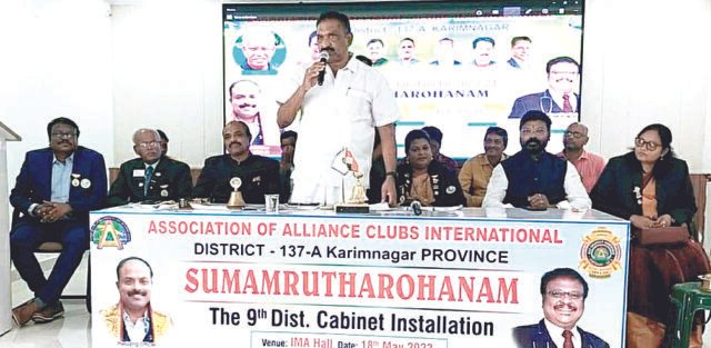 తిమ్మాపూర్, మే 19 (విశ్వం న్యూస్) : కరీంనగర్ లోని ఐఎంఏ హాల్లో శుక్రవారం అసోసియేషన్ ఆఫ్ అలయన్స్ క్లబ్స్ ఇంటర్నేషనల్ డిస్టిక్ -137 ఏ ఆధ్వర్యంలో ఇన్స్టలేషన్ ప్రోగ్రాంను కరీంనగర్ నగర మేయర్ యాదగిరి సునీల్ రావు చేతుల మీదుగా ప్రారంభించారు. ఈ కార్యక్రమానికి ముఖ్య అతిథులుగా విచ్చేసిన అలయన్స్ క్లబ్స్ ఇంటర్నే షనల్ వైస్ ప్రెసిడెంట్ ఆర్. మత్తివన్నన్, ఇంటర్నే షనల్ డైరెక్టర్ నవీన శెట్టింగర్, ఇంటర్నేషనల్ కమిటీ చైర్మన్ డా. ఎలగందల శ్రీనివాస్ (వాసుదేవ హాస్పిటల్) చేతుల మీదుగా ఇన్స్టాలేషన్ కార్యక్రమాన్ని నిర్వహించారు. ఈ కార్యక్రమంలో డిస్ట్రిక్ట్ గవర్నర్ డా. గాలిపెల్లి నాగేశ్వర్, వైస్ డిస్టిక్ట్ గవర్నర్ చేరిమెల వెంకటేశ్వర్లు, వైస్ డిస్టిక్ట్ గవర్నర్ చీకోటి శ్రీనివాస్ గాంధీ, పిఆర్ఓ సాగర్ రెడ్డి, డిస్టిక్ట్ కాబినెట్ ట్రెజరర్ కామినేని శ్రీనివాస్ లకు డిస్టిక్-137 బాధ్యులుగా చేస్తూ ప్రమాణస్వీకారోత్సవాన్ని నిర్వహించారు.