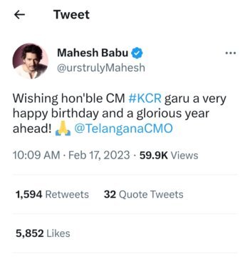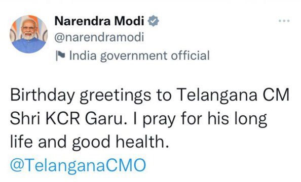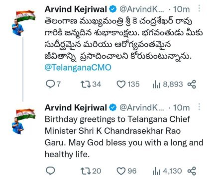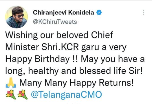 - సీఎం కేసీఆర్ కు శుభాకాంక్షలు తెలిపిన ప్రధాని మోదీ, గవర్నర్ తమిళిసై, చిరంజీవి, పవన్ కళ్యాణ్, అరవింద్ కేజ్రీవాల్, మహేష్ బాబు