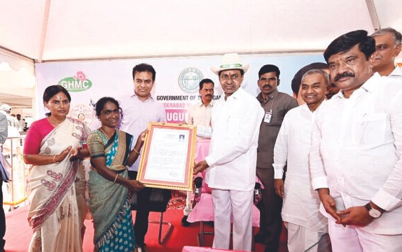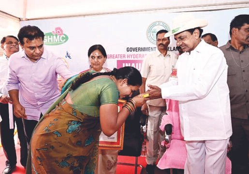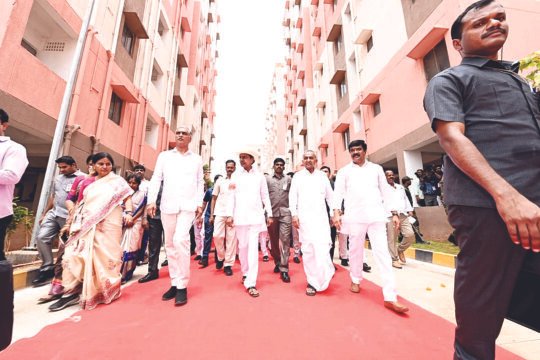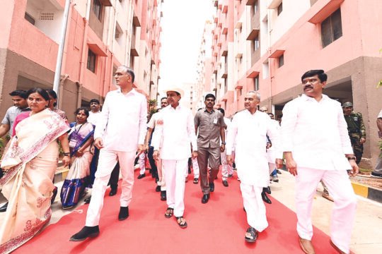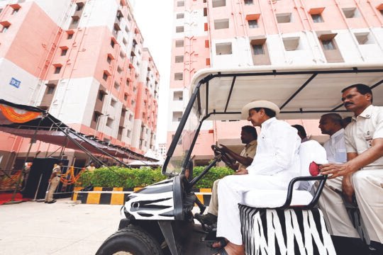 ఎలక్ట్రిక్ బగ్గీలో 2.5 కిలోమీటర్ల విస్తీర్ణంలో కలియతిరిగి కొల్లూరు డబుల్ బెడ్ రూం గృహాల సముదాయాన్ని పరిశీలించిన సీఎం కేసీఆర్.అనంతరం లబ్ధిదారులకు ఇండ్ల పట్టాలను అందించారు