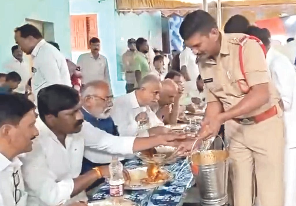 సాధారణంగా పోలీసులు శాంతి భద్రతలను పర్యవేక్షించడం, ప్రజల రక్షణే ప్రధాన కర్తవ్యంగా నిర్వర్తించాల్సి ఉంటుంది. కానీ ఈ ఘటనలో మాత్రం ఒక పోలీస్ అధికారి తన విధులను పక్కనపెట్టి క్యాటరింగ్ సిబ్బంది పాత్రలోకి దిగినట్టు కనిపిస్తున్నారని విమర్శలు వెల్లువెత్తుతున్నాయి. అధికార పార్టీ నేతలకు స్వయంగా వంటకాలు వడ్డించడం, “మటన్ ముక్క వేసుకోండి సార్” అంటూ ఆహ్వానించే స్థాయికి దిగజారడం పోలీస్ వ్యవస్థ గౌరవాన్ని తగ్గించిందనే ఆరోపణలు వినిపిస్తున్నాయి.